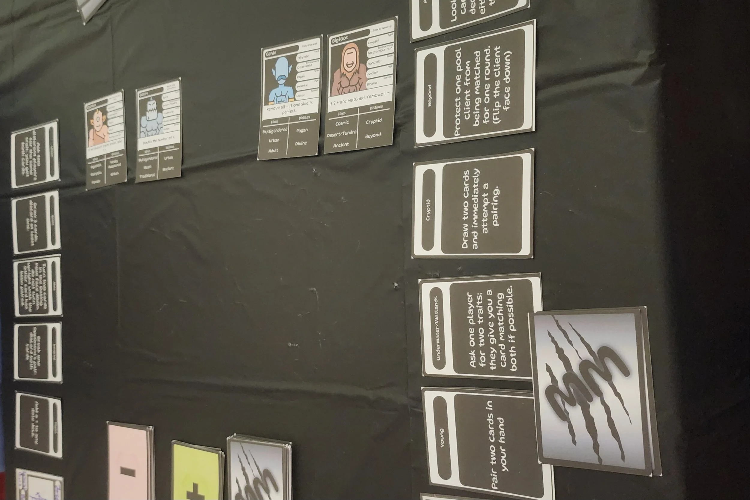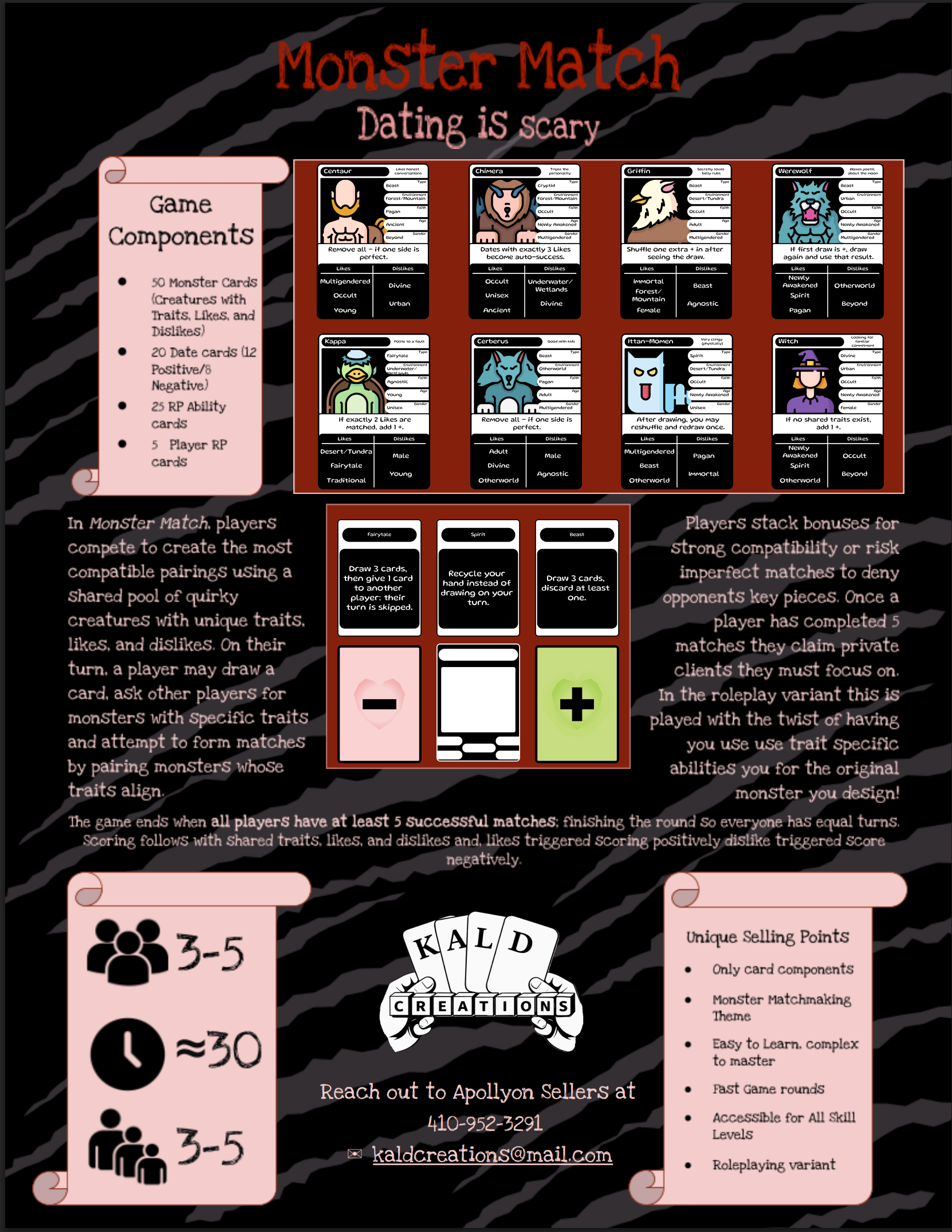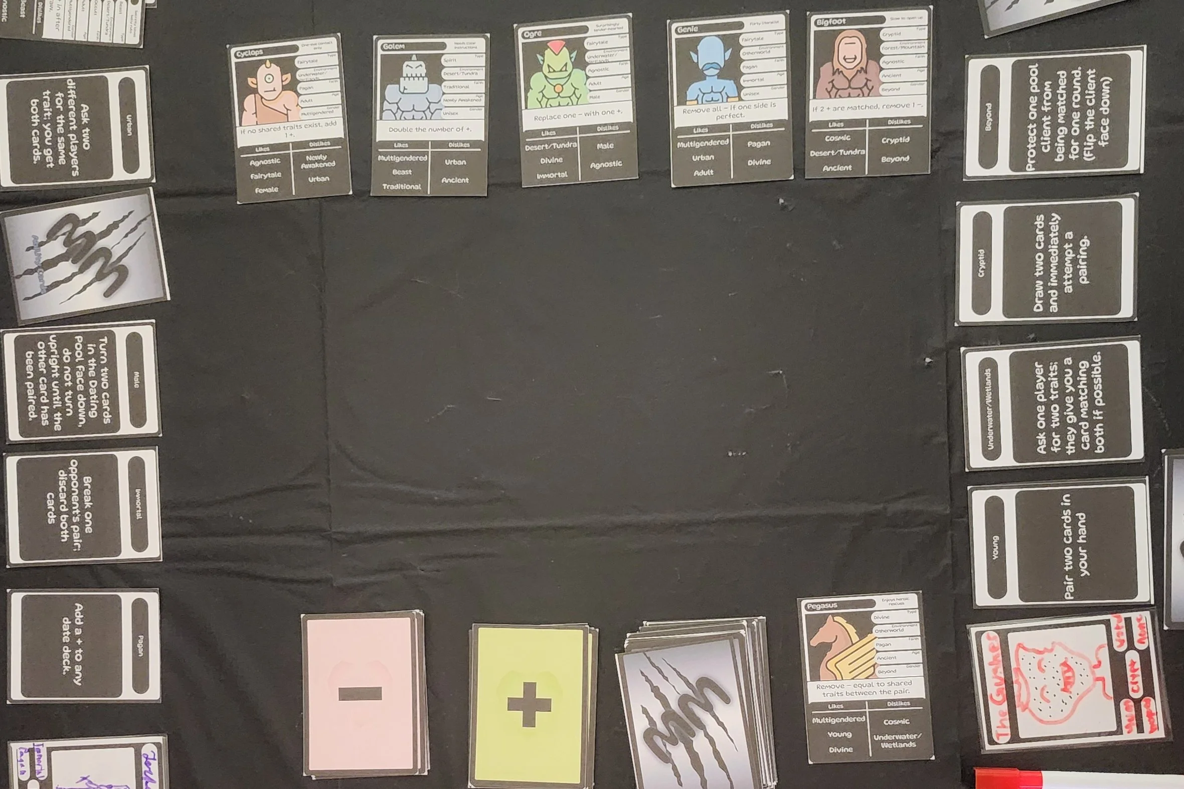 …is a competitive social matchmaking game where players race to form the best monster couples. You’ll collect creatures, negotiate with rivals, sabotage opportunities, and gamble on chaotic first dates. Compatibility matters, but luck, timing, and a little mischief decide everything. A match only counts if the monsters survive their date. Perfect pairings are rare. Disasters are memorable.
